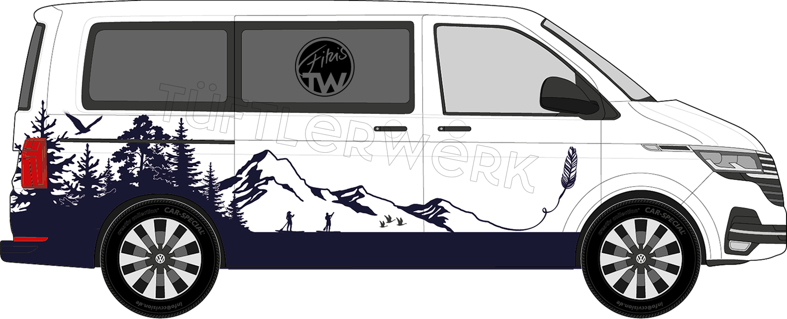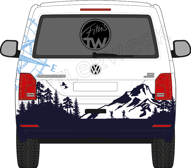 Die Feder zeichnet die Bergsilhouette auf den Camper. Der Kompass ist in die Landschaft integriert und auf dem See gehen Sie Ihrem Lieblingssport nach.