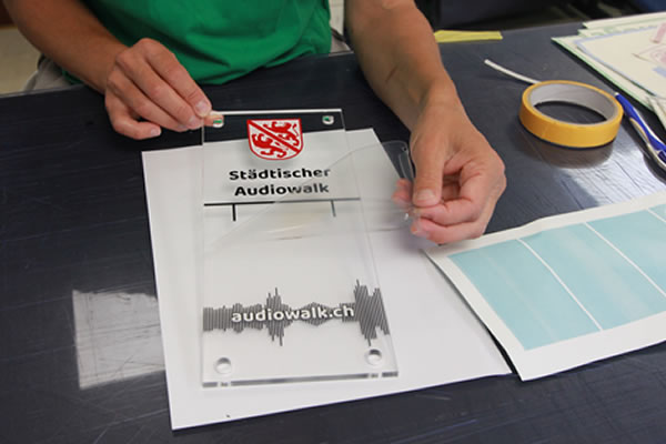 Die meisten Schilder haben wir an verschiedenen Fassaden montiert. Zwei Stangen konnten wir bei bestehenden Stangen befestigen und die letzte im Park haben wir einbetoniert.