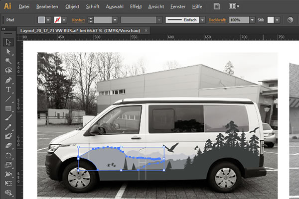 Die Folie wird entsprechen dem Sujet geschnitten und auf den VW-Bus aufgezogen.
